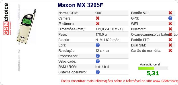 Dados sobre o telemóvel Maxon MX 3205F na sua página