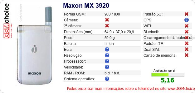 Dados sobre o telemóvel Maxon MX 3920 na sua página