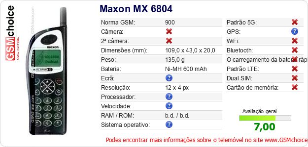 Dados sobre o telemóvel Maxon MX 6804 na sua página