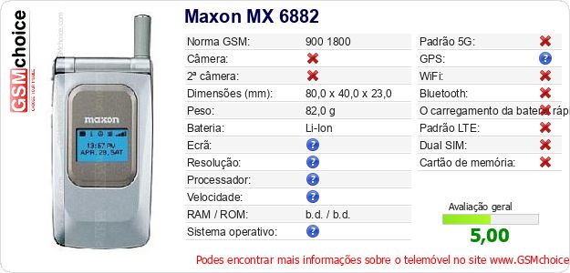 Dados sobre o telemóvel Maxon MX 6882 na sua página