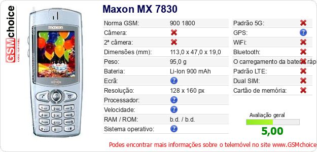 Dados sobre o telemóvel Maxon MX 7830 na sua página