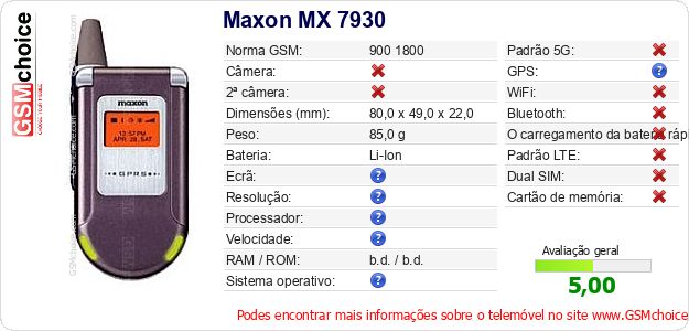 Dados sobre o telemóvel Maxon MX 7930 na sua página