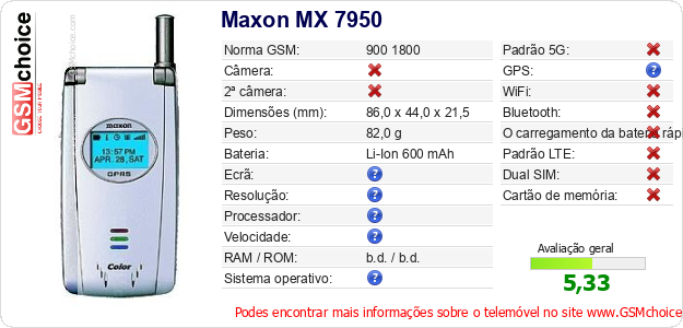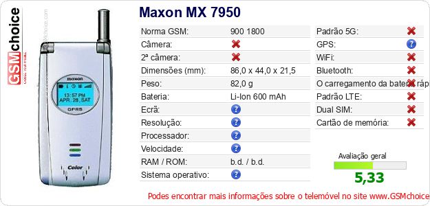 Dados sobre o telemóvel Maxon MX 7950 na sua página