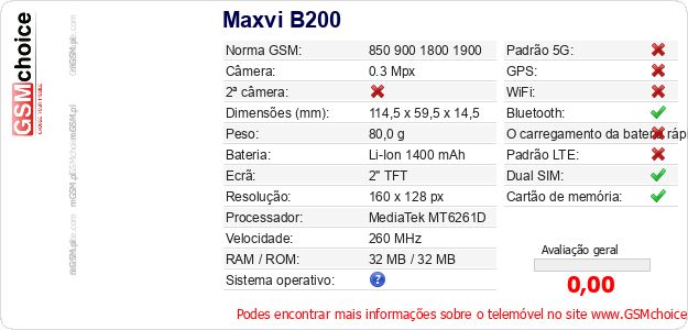 Dados sobre o telemóvel Maxvi B200 na sua página