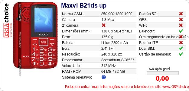 Dados sobre o telemóvel Maxvi B21ds up na sua página