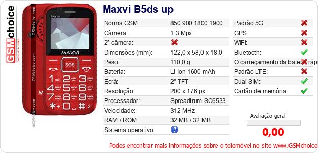 Dados sobre o telemóvel Maxvi B5ds up na sua página