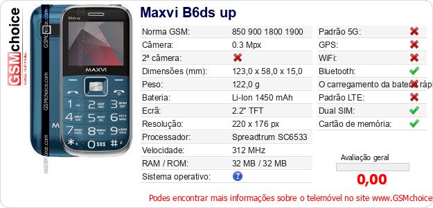 Dados sobre o telemóvel Maxvi B6ds up na sua página