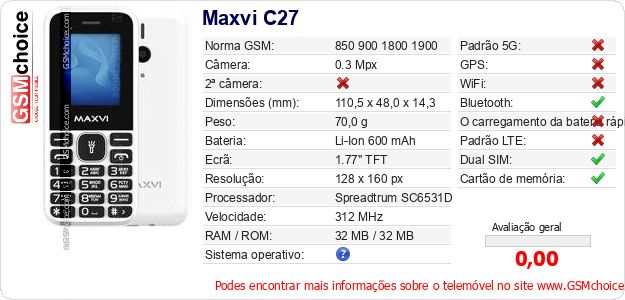 Dados sobre o telemóvel Maxvi C27 na sua página