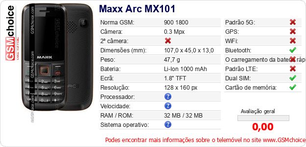 Dados sobre o telemóvel Maxx Arc MX101 na sua página