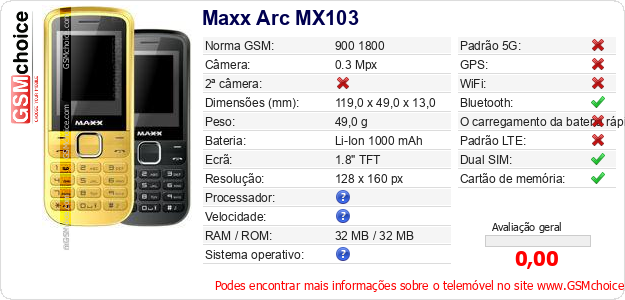 Dados sobre o telemóvel Maxx Arc MX103 na sua página