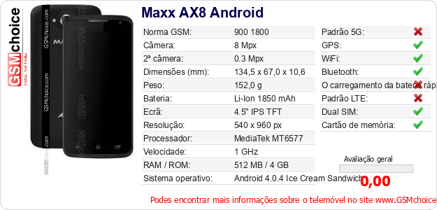 Dados sobre o telemóvel Maxx AX8 Android na sua página