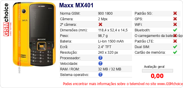 Dados sobre o telemóvel Maxx MX401 na sua página