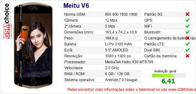 Dados sobre o telemóvel Meitu V6 na sua página