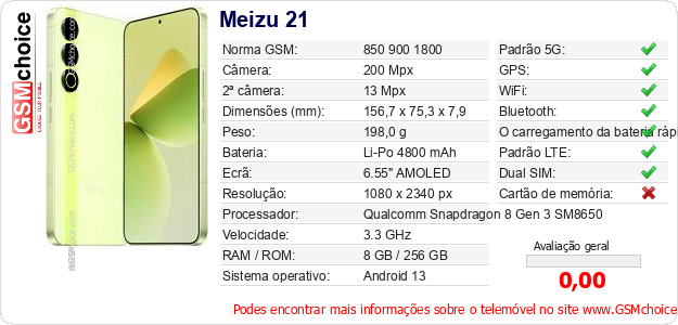Dados sobre o telemóvel Meizu 21 na sua página