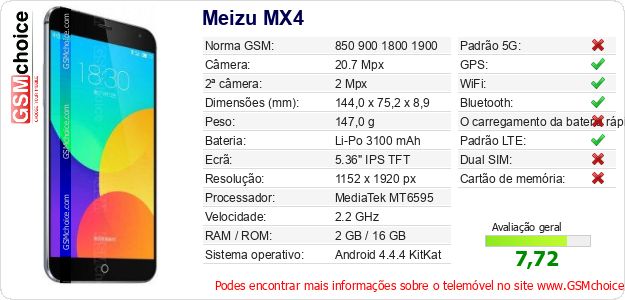Dados sobre o telemóvel Meizu MX4 na sua página
