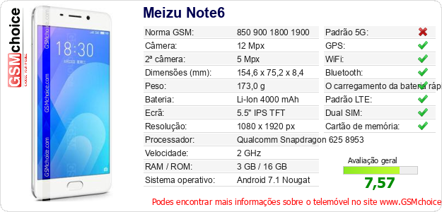 Dados sobre o telemóvel Meizu Note6 na sua página