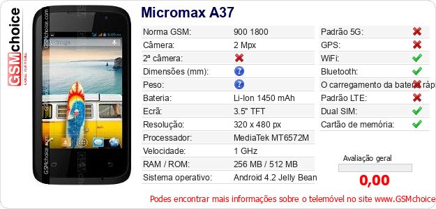 Dados sobre o telemóvel Micromax A37 na sua página