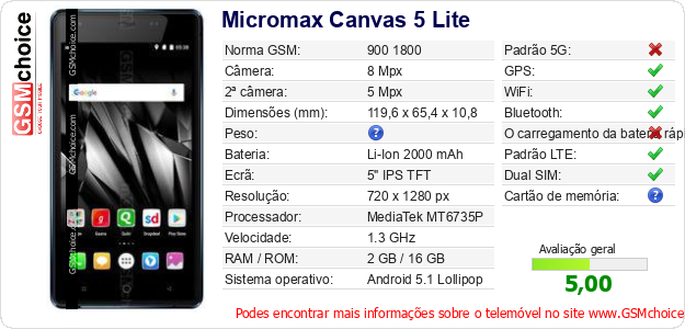Dados sobre o telemóvel Micromax Canvas 5 Lite na sua página