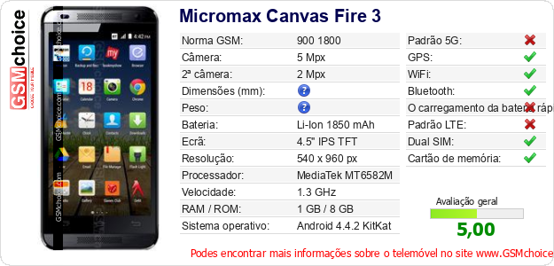 Dados sobre o telemóvel Micromax Canvas Fire 3 na sua página