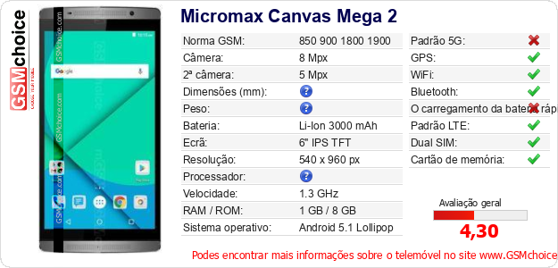Dados sobre o telemóvel Micromax Canvas Mega 2 na sua página