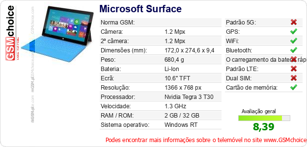 Dados sobre o telemóvel Microsoft Surface na sua página