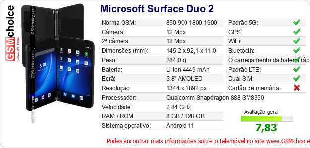 Dados sobre o telemóvel Microsoft Surface Duo 2 na sua página