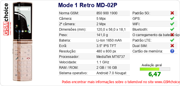 Dados sobre o telemóvel Mode 1 Retro MD-02P na sua página