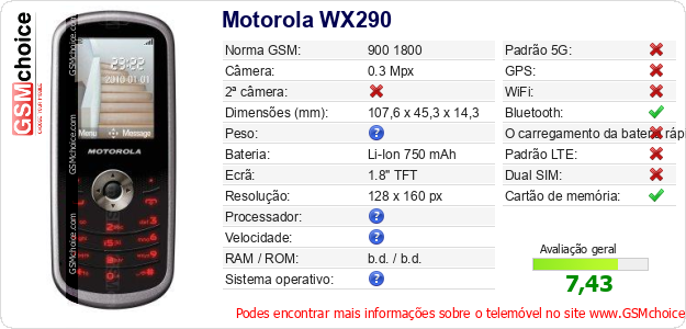 Dados sobre o telemóvel Motorola WX290 na sua página