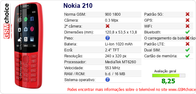 Dados sobre o telemóvel Nokia 210 na sua página