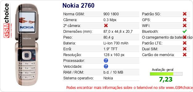 Dados sobre o telemóvel Nokia 2760 na sua página