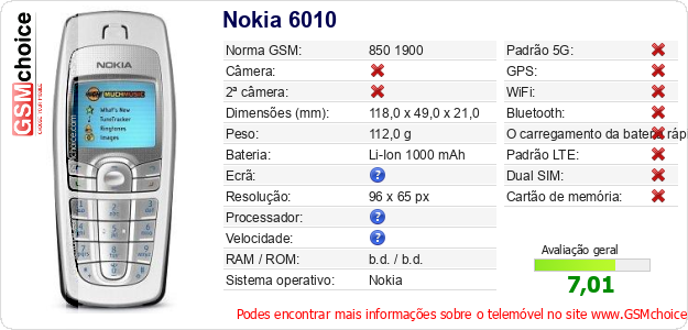 Dados sobre o telemóvel Nokia 6010 na sua página