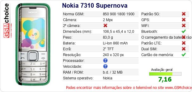 Dados sobre o telemóvel Nokia 7310 Supernova na sua página