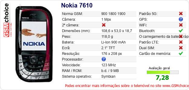 Dados sobre o telemóvel Nokia 7610 na sua página