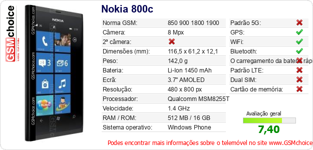 Dados sobre o telemóvel Nokia 800c na sua página