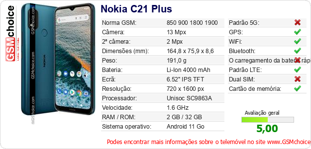 Dados sobre o telemóvel Nokia C21 Plus na sua página
