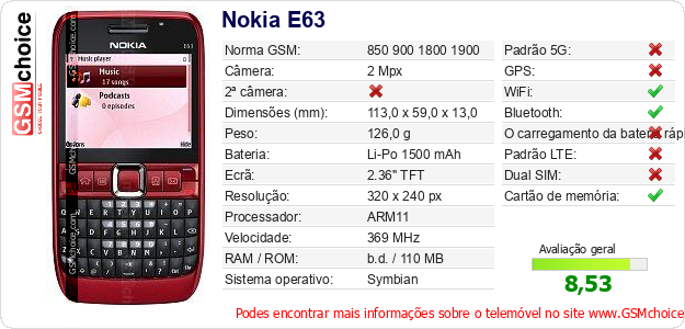 Dados sobre o telemóvel Nokia E63 na sua página