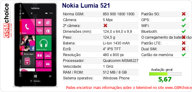 Dados sobre o telemóvel Nokia Lumia 521 na sua página