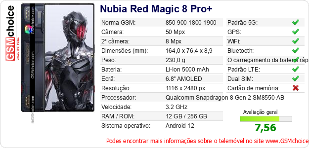 Dados sobre o telemóvel Nubia Red Magic 8 Pro+ na sua página