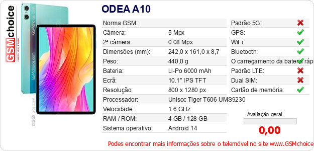 Dados sobre o telemóvel ODEA A10 na sua página