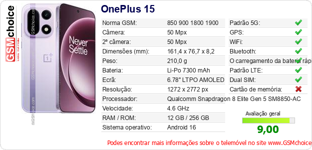 Dados sobre o telemóvel OnePlus 15 na sua página