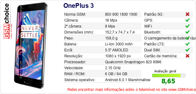 Dados sobre o telemóvel OnePlus 3 na sua página
