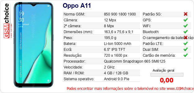 Dados sobre o telemóvel Oppo A11 na sua página