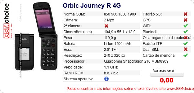 Dados sobre o telemóvel Orbic Journey R 4G na sua página