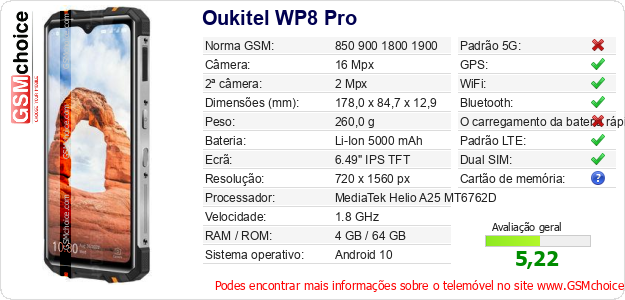 Dados sobre o telemóvel Oukitel WP8 Pro na sua página