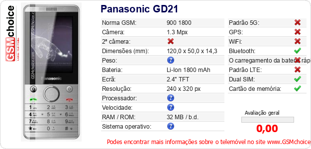 Dados sobre o telemóvel Panasonic GD21 na sua página
