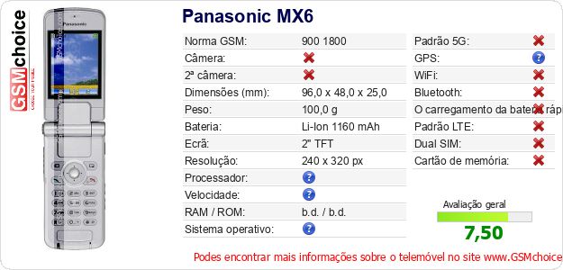 Dados sobre o telemóvel Panasonic MX6 na sua página