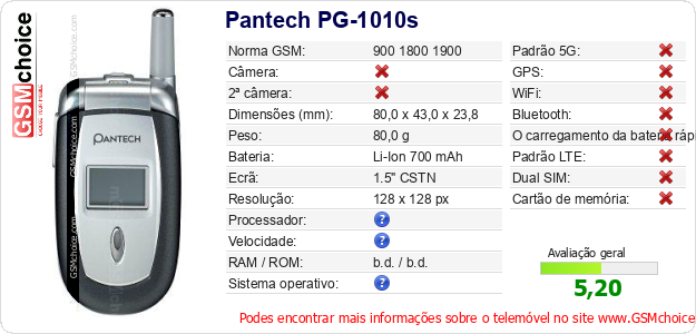 Dados sobre o telemóvel Pantech PG-1010s na sua página
