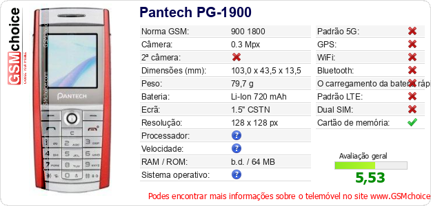 Dados sobre o telemóvel Pantech PG-1900 na sua página