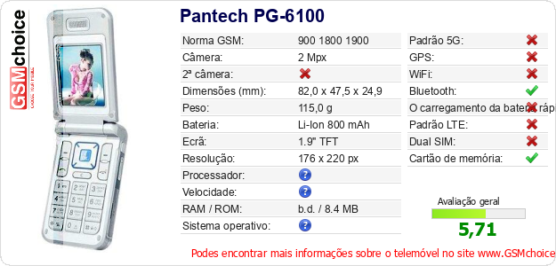 Dados sobre o telemóvel Pantech PG-6100 na sua página