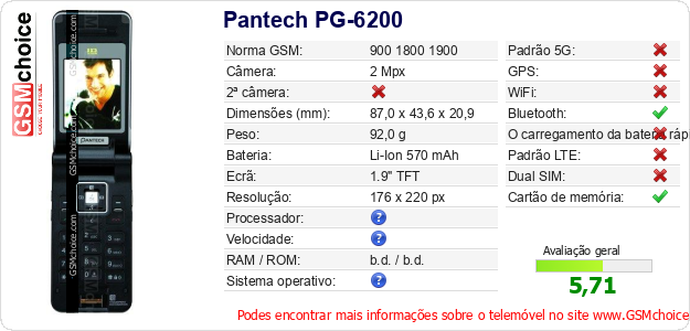 Dados sobre o telemóvel Pantech PG-6200 na sua página